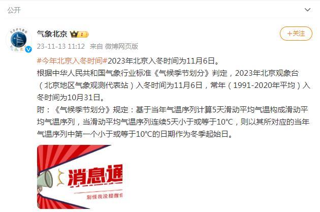 中新網(wǎng)11月13日電 據(jù)北京市氣象局官方微博13日消息,2023年北京入冬時(shí)間為11月6日。根據(jù)中華人民共和國(guó)氣象行業(yè)標(biāo)準(zhǔn)《氣候季節(jié)劃分》判定,2023年北京觀(guān)象臺(tái)(北京地區(qū)氣象觀(guān)測(cè)代表站)入冬時(shí)間為11月6日,常年(1991-2020年平均)入冬時(shí)間為10月31日。