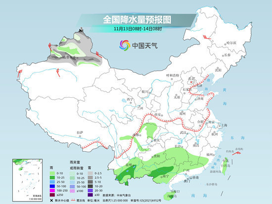具體來看,今天,新疆北部等地部分地區(qū)有小雪或雨夾雪,局地有中到大雪。西南地區(qū)南部、江南南部、華南大部等地部分地區(qū)有小到中雨,局地有大雨。