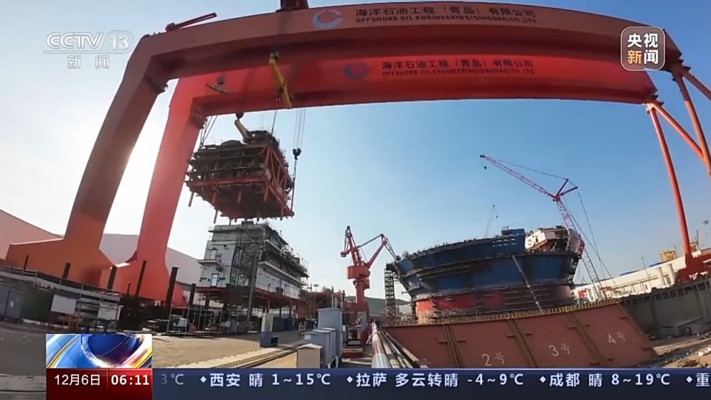 總臺(tái)央視記者 張叢婧:這里是青島海洋工程高新裝備制造基地,隨著現(xiàn)場最后一個(gè)模塊吊裝就位,意味著經(jīng)過20個(gè)月的施工,這個(gè)集原油生產(chǎn)、存儲(chǔ)、外輸?shù)裙δ苡谝惑w的新型“海上油氣加工廠”主體結(jié)構(gòu)建造完工,進(jìn)入集成調(diào)試階段。