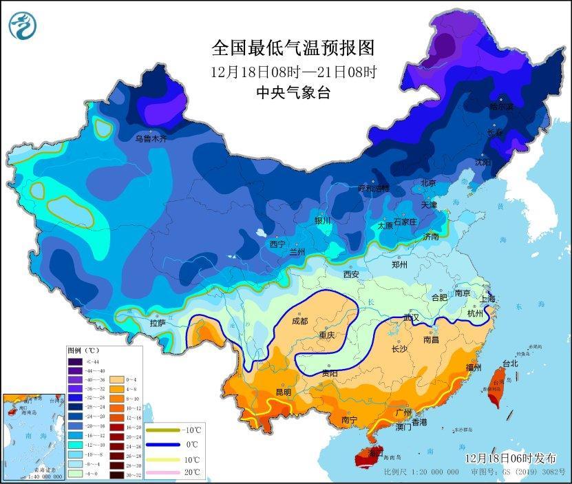 圖2 全國最低氣溫預(yù)報圖(12月18日08時-21日08時)