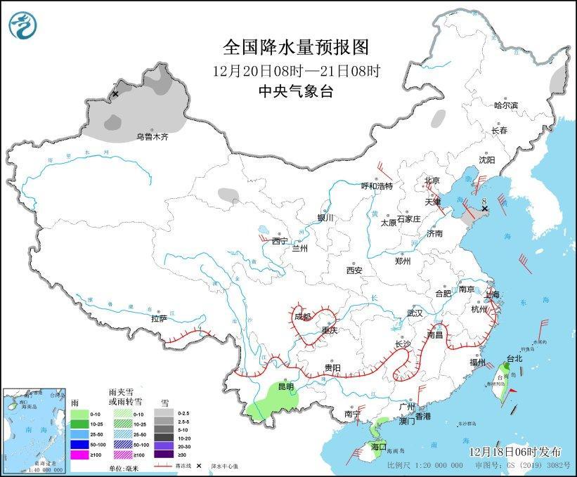 12月19日08時至20日08時,新疆北疆北部、吉林東南部、遼寧東部、西藏東北部、青海北部和東部、甘肅河西、山東半島、川西高原北部、貴州西部、安徽南部、江蘇中南部、江西北部等地的部分地區(qū)有小雪或雨夾雪。江南中南部、云南東南部、華南中北部、海南島、臺灣島等地的部分地區(qū)有小到中中雨。內(nèi)蒙古中部、青海南部、吉林西部、遼東半島、山東半島、江蘇南部、浙江北部、廣東沿海等地的部分地區(qū)有4~6級風(fēng)(見圖4)。