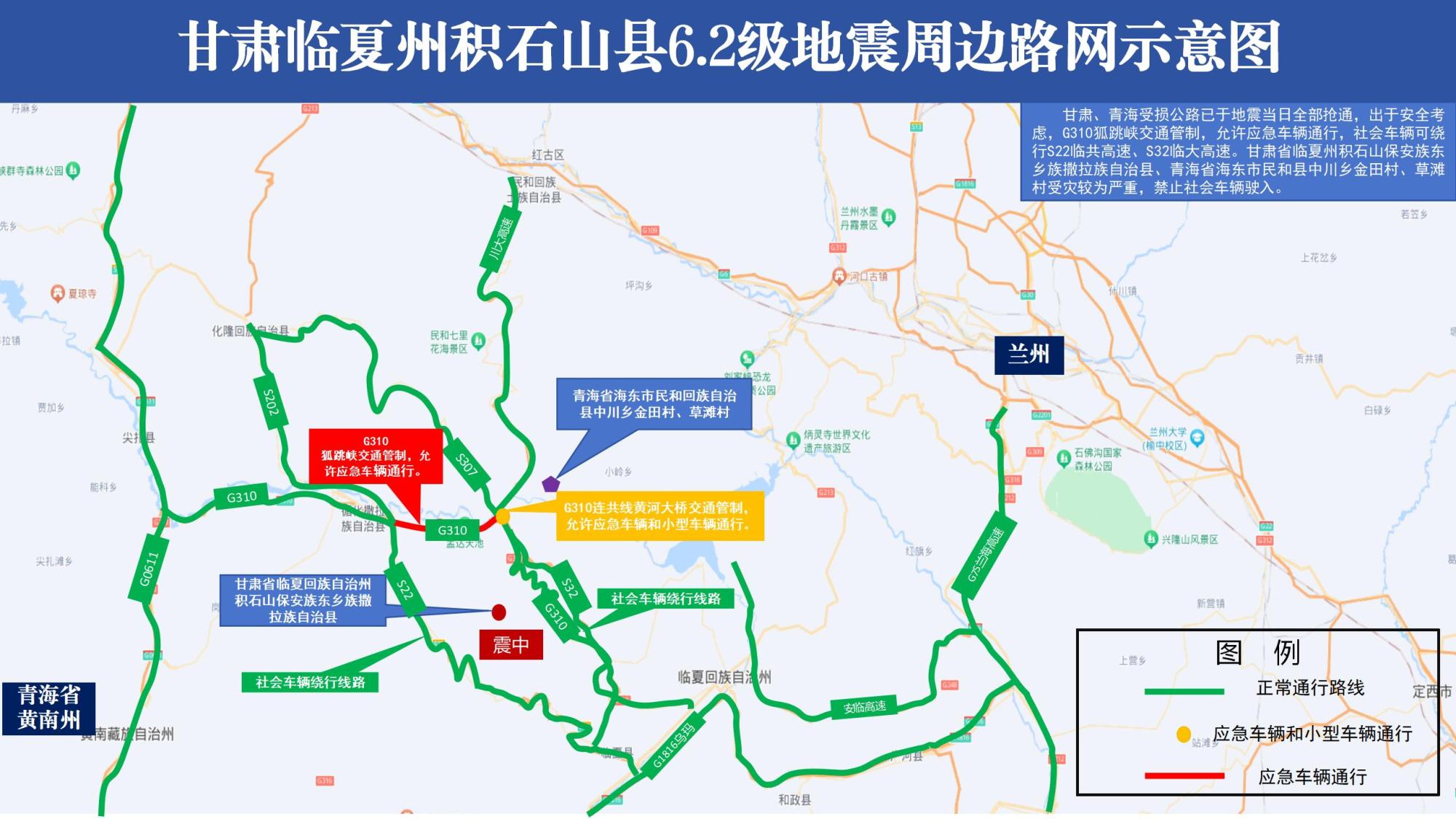 甘肅臨夏州積石山縣6.2級地震周邊路網(wǎng)示意圖(圖片來源:交通運(yùn)輸部)