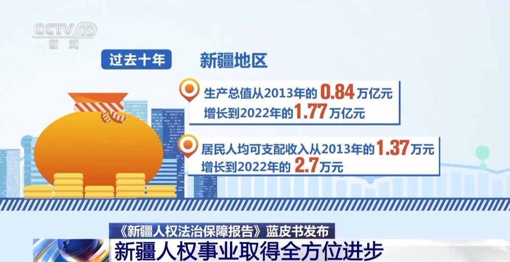 會議期間,還舉行了《新疆人權(quán)法治保障報告》藍皮書揭幕儀式。過去十年,新疆地區(qū)生產(chǎn)總值從2013年的0.84萬億元增長到2022年的1.77萬億元,居民人均可支配收入從2013年的1.37萬元增長到2022年的2.7萬元。