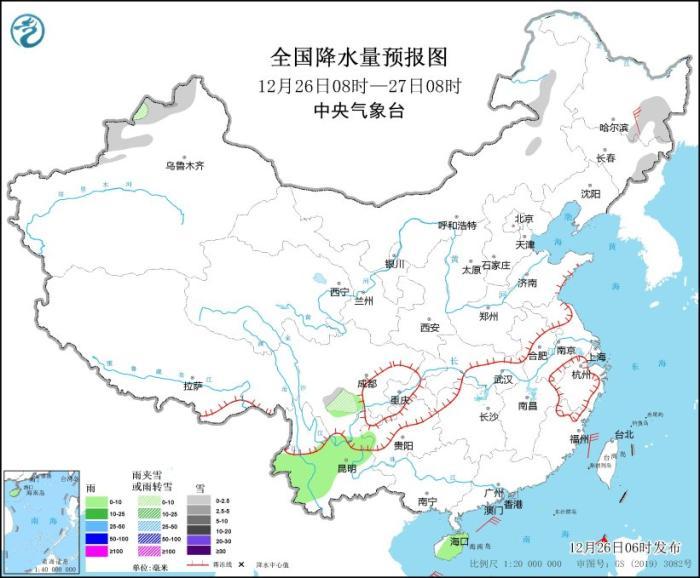 圖1 全國(guó)降水量預(yù)報(bào)圖(12月26日08時(shí)-27日08時(shí))