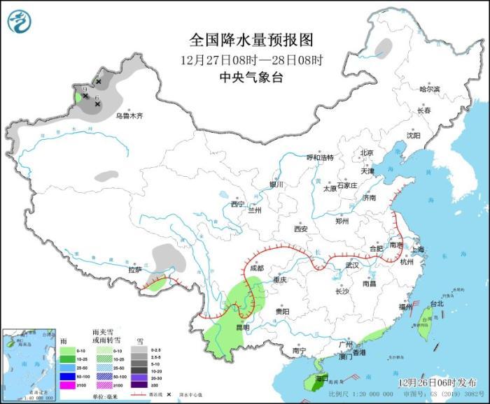 12月27日08時(shí)至28日08時(shí),內(nèi)蒙古東北部、新疆北部和南疆西部山區(qū)、西藏東部等地部分地區(qū)有小到中雪或雨夾雪,其中,新疆北疆北部和伊犁河谷等地部分地區(qū)有大雪(5~9毫米)。云南中部、廣東東南部沿海、海南島、臺(tái)灣島等地部分地區(qū)有小到中雨(見(jiàn)圖2)。