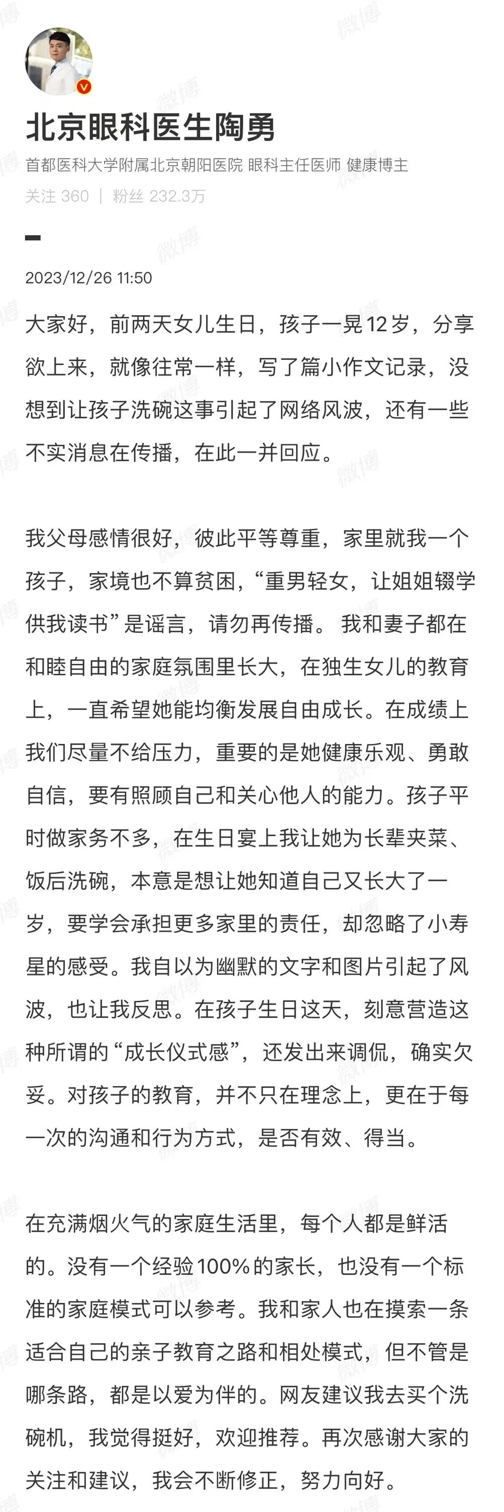 12月23日,陶勇醫(yī)生在微博分享了與12歲女兒的相處日常,文中講到生日這天,女兒拍照不配合。要求女兒在給長(zhǎng)輩盛飯夾菜之后,陶勇還希望女兒可以洗碗。在家里人勸阻之后,陶勇還是說(shuō)動(dòng)女兒洗了碗。陶勇為此心里高興,于是發(fā)文分享此事。