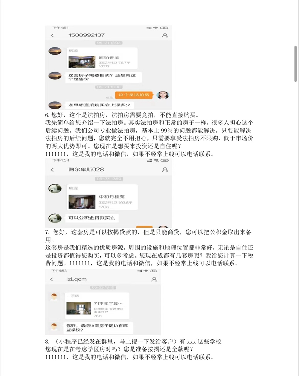 吳先生說(shuō),他所在的維權(quán)群里有30多位消費(fèi)者,盡管大家是與不同中介簽訂的合同,但梳理發(fā)現(xiàn),這些“法拍房中介”前期向客戶推銷時(shí)有固定的話術(shù)。“第一,就是說(shuō)現(xiàn)在很多房子在拍賣;依據(jù)我們的經(jīng)驗(yàn),在這一帶,這種類型的房子二十幾萬(wàn)就能拿下來(lái)了;他就告訴你,基本上這個(gè)價(jià)格不會(huì)有什么變化的,你只要跟我們簽約,我們就能幫你服務(wù)、幫你拿到?!?/p>