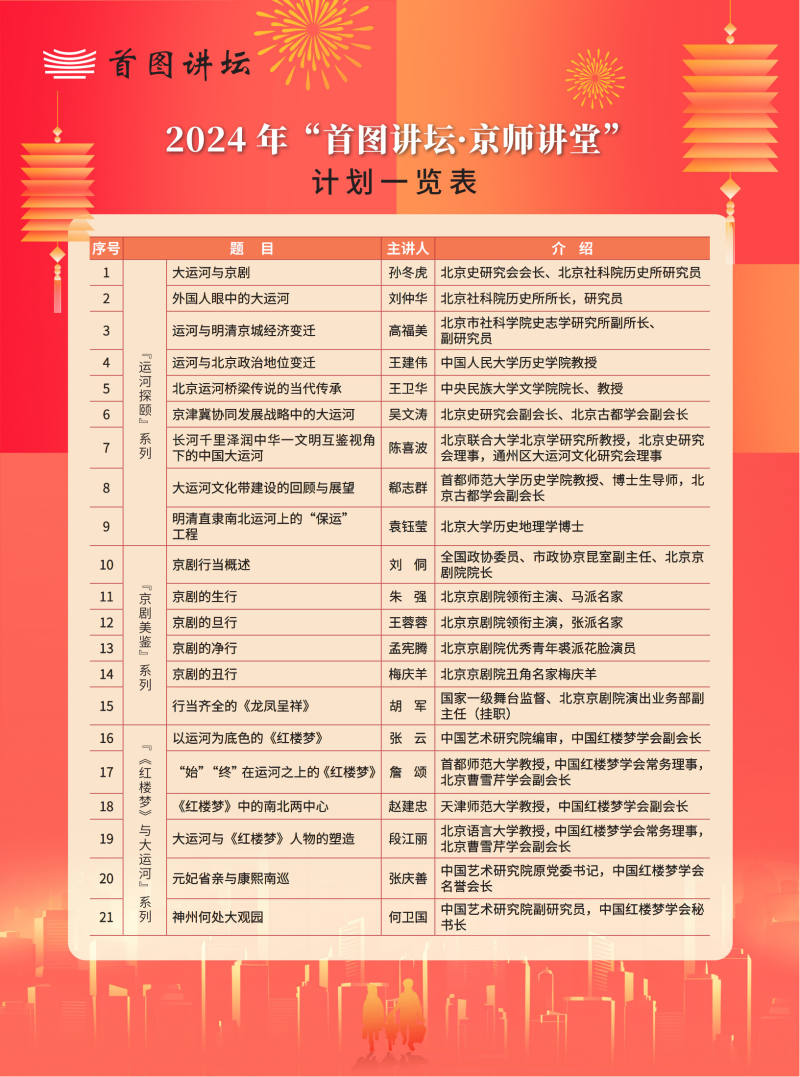 北京史研究會會長孫冬虎發(fā)布“京師講堂”2024年度主題講座計劃。全年近50場講座,包括北京胡同四合院、三山五園、明清北京商業(yè)、龍年說龍等歷史文化與社會生活主題,還有四項專題系列講座——“運河探頤”系列將以大運河的歷史變遷與運河文化的挖掘、研究、傳承為焦點,展示北京城市發(fā)展與大運河的密切關(guān)系;“京劇美鑒”系列致力于讓聽眾體味京劇國粹的獨特風韻與文化價值;“《紅樓夢》與大運河”系列將挖掘《紅樓夢》與世界文化遺產(chǎn)大運河之間的密切關(guān)聯(lián);“清朝宮廷”系列將還原清代宮廷生活的真實場景,提升聽眾關(guān)于清代歷史與文化的準確認知。