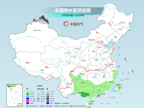 具體來(lái)看,今天新疆北疆北部、山東半島等地有小到中雪或雨夾雪,其中新疆阿勒泰、塔城的部分地區(qū)有大到暴雪,局地大暴雪(20~24毫米);四川盆地南部、貴州、江南南部和東部、華南、臺(tái)灣島等地有小雨,其中廣西南部等地的部分地區(qū)有中雨。