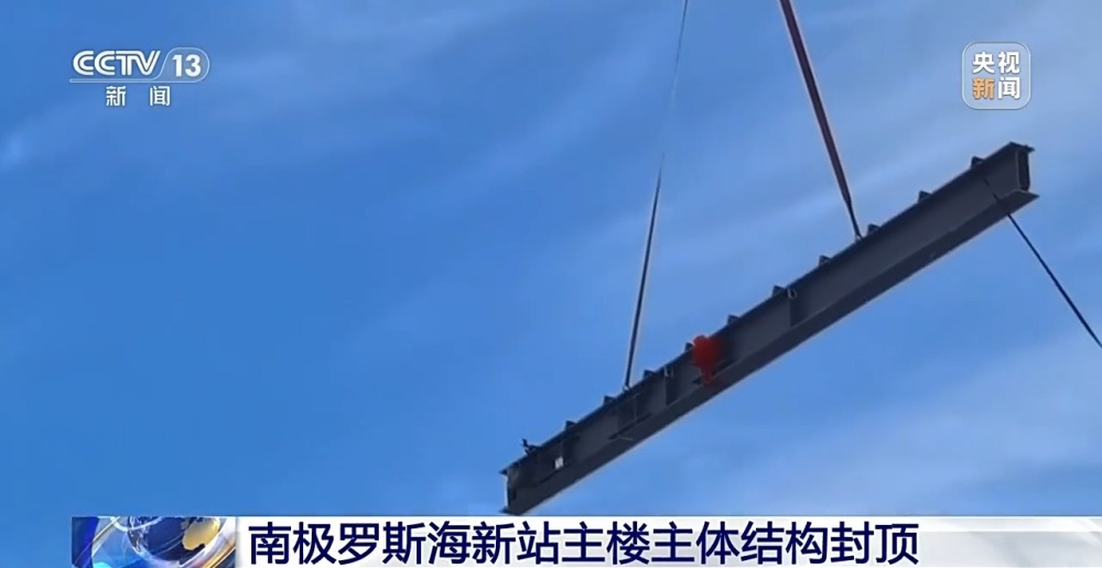 總臺央視記者 李寧:這里就是南極羅斯海新站的建設現場,現在正在進行吊裝作業(yè)的就是新站主樓的最后一根鋼梁。為了慶祝這個重要的工程節(jié)點,隊員們給這根鋼梁戴上了大紅花。隨著這根鋼梁的成功吊裝,標志著羅斯海新站的主樓主結構完成了封頂。