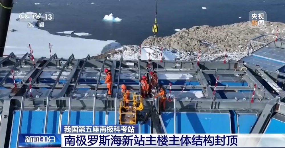今天,正在建設中的我國第五座南極科考站——羅斯海新站,完成主樓最后一根鋼梁吊裝,標志著新站主樓主體結構實現封頂。