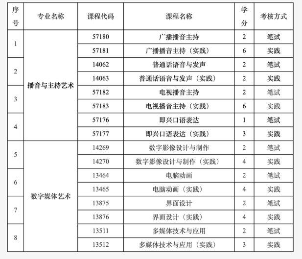 3. 調整播音與主持藝術專業(yè)(專升本)、數(shù)字媒體藝術專業(yè)(專升本)2個專業(yè)中8門課程(見下表),筆試和實踐均納入到“非筆試及實踐類課程”進行報考,由主考學校組織考試。