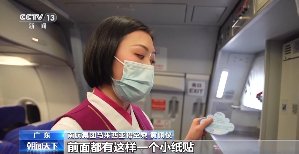 南航集團(tuán)馬來(lái)西亞籍空乘 黃佩儀:現(xiàn)在又到了春運(yùn)的時(shí)期,我們領(lǐng)資料箱的時(shí)候,特地問(wèn)一下能不能多給我們兩包,盡量保證每個(gè)睡覺(jué)的旅客,前面都有這樣一個(gè)小紙貼。