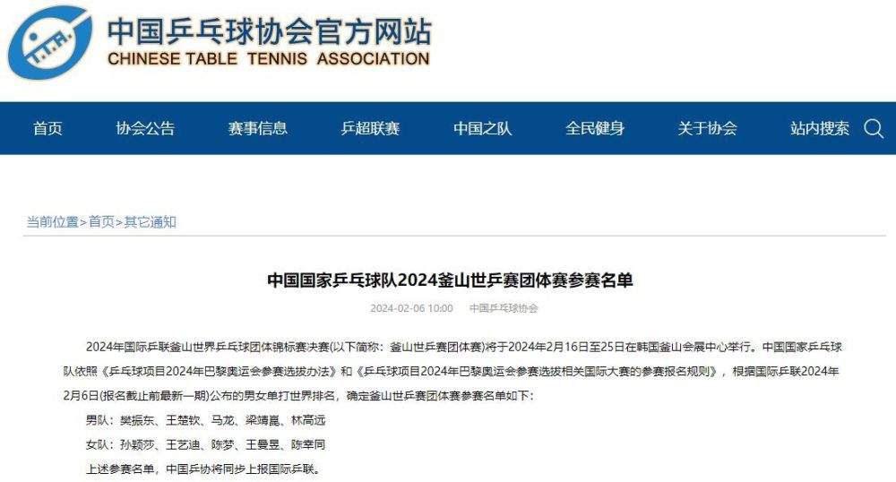 北京時(shí)間2月6日,中國乒協(xié)官網(wǎng)發(fā)布了中國國家乒乓球隊(duì)釜山世乒賽團(tuán)體賽參賽名單。中國國家乒乓球隊(duì)依照《乒乓球項(xiàng)目2024年巴黎奧運(yùn)會(huì)參賽選拔辦法》和《乒乓球項(xiàng)目2024年巴黎奧運(yùn)會(huì)參賽選拔相關(guān)國際大賽的參賽報(bào)名規(guī)則》,根據(jù)國際乒聯(lián)2024年2月6日(報(bào)名截止前最新一期)公布的男女單打世界排名,確定釜山世乒賽團(tuán)體賽參賽名單如下: