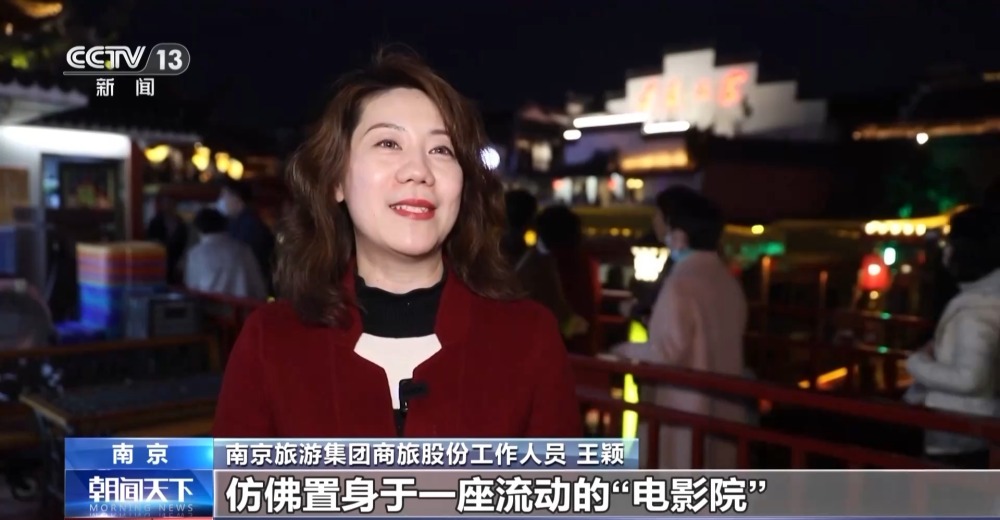 南京旅游集團(tuán)商旅股份工作人員 王穎:每艘游船上都裝有GPS定位系統(tǒng),再配合沿岸的燈光、投影,讓游船在行駛途中仿佛置身于一座流動(dòng)“電影院”,完整地貫通、復(fù)刻“十里秦淮”的歷史景象。