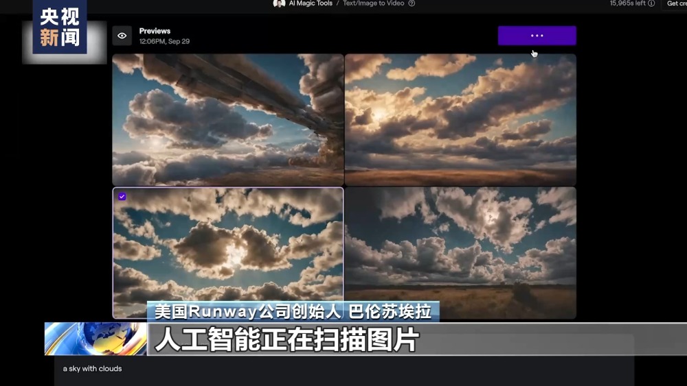 美國(guó)Runway公司創(chuàng)始人 巴倫蘇埃拉:讓我們做一個(gè)有云的天空,我可以選擇電影風(fēng)格或預(yù)覽角度。我真的很喜歡這張,它看起來就像光是從云里出來的。人工智能正在掃描圖片,并由此生成一段視頻。你現(xiàn)在可以看到云正在移動(dòng),天空正在變暗,暴風(fēng)雨就要來了。