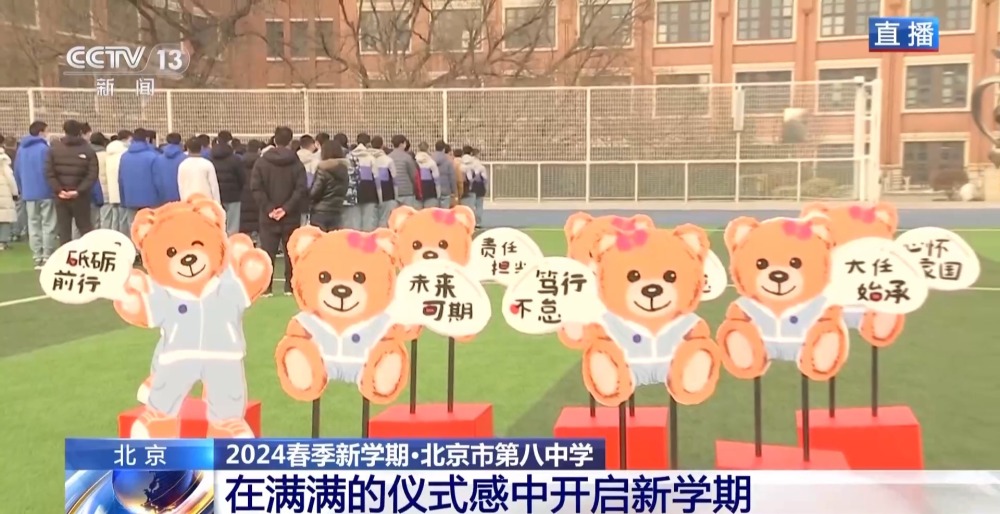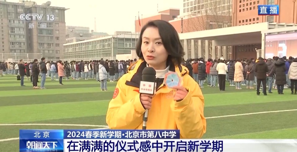 總臺(tái)央視記者 李晶晶:北京市第八中學(xué)高中部,近2300名高中生齊聚國旗下,舉行新學(xué)期的第一次升旗儀式,在滿滿的儀式感中開啟新的學(xué)習(xí)生活。今年是龍年,有句祝福語叫“龍行龘龘,前程朤朤”,現(xiàn)在正在進(jìn)行的國旗下的演講,題目就是《龘龘朤朤間是向上的力量》,老師祝福學(xué)生們像龍一樣騰飛而上,同時(shí)也是鼓勵(lì)他們要有夢想,為實(shí)現(xiàn)夢想不斷努力向上。