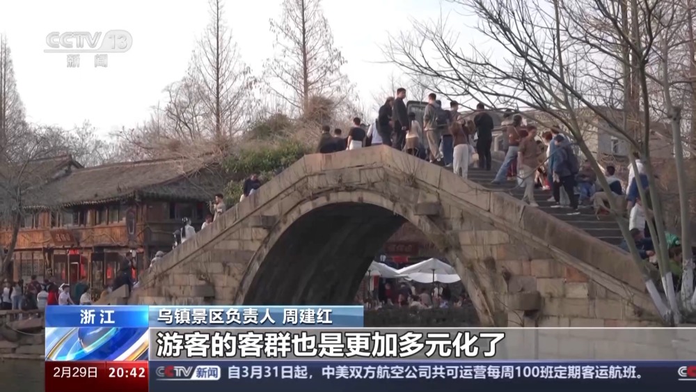 烏鎮(zhèn)景區(qū)負責人 周建紅:二月份來看,我們整個線上營銷比例已經(jīng)超過了線下,占比達到了60%,旅游產(chǎn)品也是在做不斷的一個迭代,游客的客群也是更加多元化了。十年前的春節(jié),游客量在20多萬,那這一次的春節(jié)的話,我們已經(jīng)是突破了50萬人次,也是翻倍的一個增長。