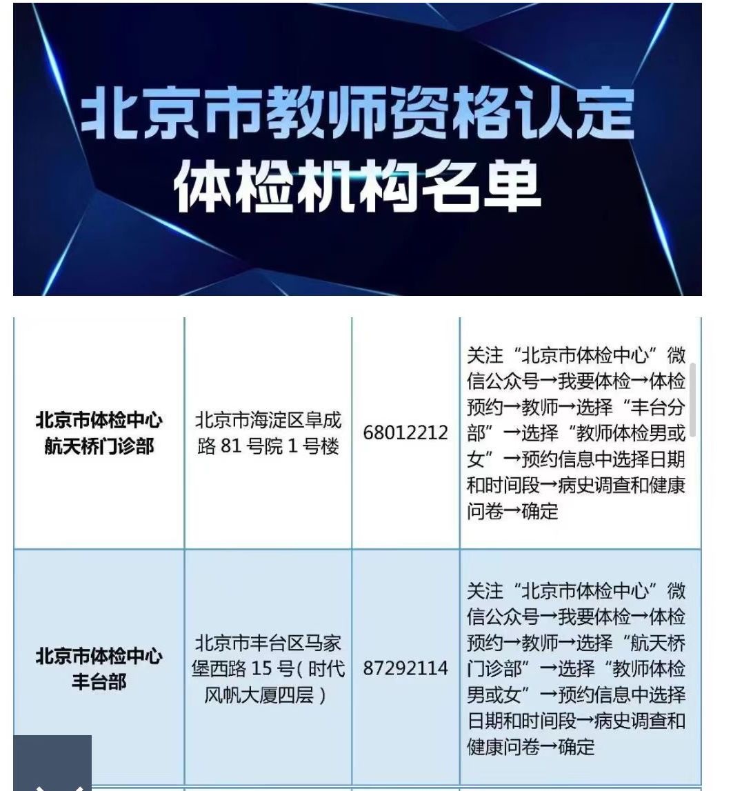 尚未進行體檢的請自行與體檢機構聯(lián)系完成體檢。北京市體檢中心將于3月中下旬在豐臺部、航天橋門診部和馬甸部舉行多場教師資格認定體檢專場。具體時間安排可聯(lián)系相應機構咨詢。