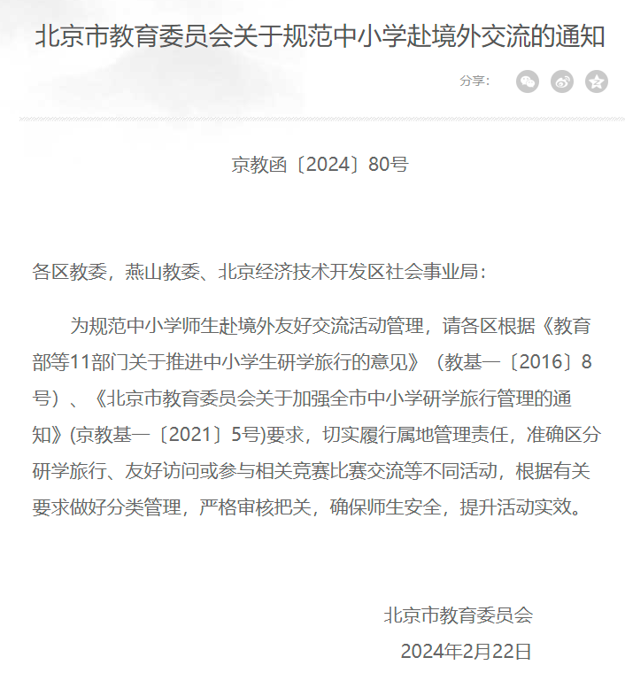 央廣網(wǎng)北京3月11日消息(記者馮儀)近日,北京市教委發(fā)布關(guān)于規(guī)范中小學(xué)赴境外交流的通知,通知中提到,請各區(qū)根據(jù)《教育部等11部門關(guān)于推進(jìn)中小學(xué)生研學(xué)旅行的意見》(教基一〔2016〕8號)、《北京市教育委員會關(guān)于加強全市中小學(xué)研學(xué)旅行管理的通知》(京教基一〔2021〕5號)要求,切實履行屬地管理責(zé)任,準(zhǔn)確區(qū)分研學(xué)旅行、友好訪問或參與相關(guān)競賽比賽交流等不同活動,根據(jù)有關(guān)要求做好分類管理,嚴(yán)格審核把關(guān),確保師生安全,提升活動實效。