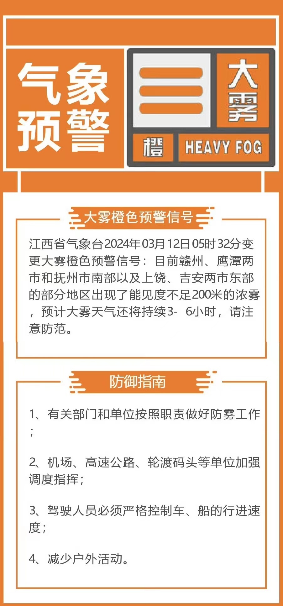 江西省氣象臺2024年3月12日5時(shí)32分變更大霧橙色預(yù)警信號:目前贛州、鷹潭兩市和撫州市南部以及上饒、吉安兩市東部的部分地區(qū)出現(xiàn)了能見度不足200米的濃霧,預(yù)計(jì)大霧天氣還將持續(xù)3~6小時(shí),請注意防范。