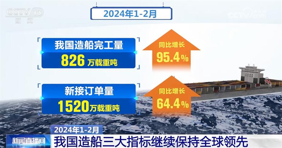 最新數(shù)據(jù)顯示,2024年1—2月,我國造船完工量826萬載重噸,同比增長95.4%;新接訂單量1520萬載重噸,同比增長64.4%;截至2月底,手持訂單量14919萬載重噸,同比增長31.3%,造船三大指標國際市場份額繼續(xù)全球領先。