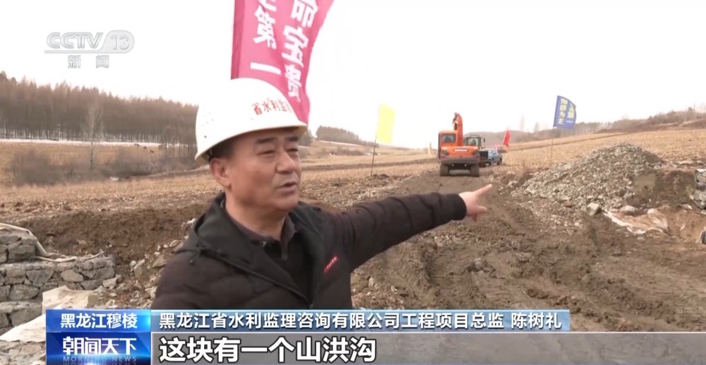 黑龍江省水利監(jiān)理咨詢有限公司工程項目總監(jiān) 陳樹禮:這塊有一個山洪溝,水土流失非常嚴重,通過項目把這個(地方)用石籠進行護砌,保證土地面積不受沖刷。