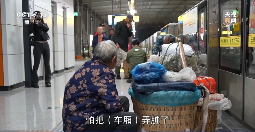 為了給菜農(nóng)提供方便,本該是6時(shí)15分打開的閘門,也是提前了5分鐘,站內(nèi)工作人員也提供力所能及的幫助。菜農(nóng)的背簍,大多是敞口,尺寸大小不超標(biāo),為了方便通行,地鐵工作人員大多采取手持檢測儀器安檢。得此方便的菜農(nóng)也在為地鐵的衛(wèi)生著想,大多都將菜包好,不讓泥水蹭臟地面。