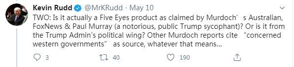 5月8日,陸克文更是在英國《衛(wèi)報》發(fā)表評論,揭批默多克旗下媒體的謊言,稱其擬將焦點轉向中國,為特朗普政府抗疫不力、造成眾多人員傷亡找借口,以助力特朗普連任。