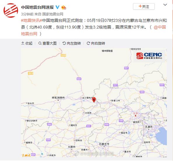 內(nèi)蒙古烏蘭察布市興和縣發(fā)生3.2級地震 震源深度12千米