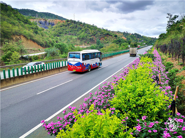 仲夏時節(jié),昆磨高速普洱至景洪段的羊蹄甲、紫薇、火把花等植物百花齊放,大風(fēng)埡口隧道口姹紫嫣紅的三角梅,寧洱收費(fèi)站立交粉嫩養(yǎng)眼的金絲桃,高速中央隔離帶嬌艷欲滴的木槿,在幾場雨水的洗禮和管理處的精心養(yǎng)護(hù)下,變得生機(jī)盎然。昆磨高速普洱管理處轄區(qū)管養(yǎng)路段植被豐富,公路蜿蜒穿梭在青山綠水間,共設(shè)有5個立交苗圃基地示范區(qū),以開花喬木為主,地被為輔,四季開花,豐富了植物層次,一立交一風(fēng)景,樹綠花紅的景象與高速公路融為一體交相輝映。