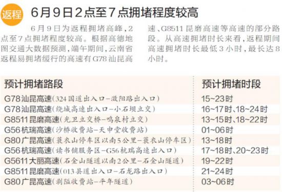 從收費站擁堵情況看,6月7日-9日,預計較為擁堵的收費站主要是勝境關(guān)收費站、小喜村收費站、河口收費站、昆明收費站。其中勝境關(guān)收費站擁堵時長達2.7小時,車速為14公里/小時。