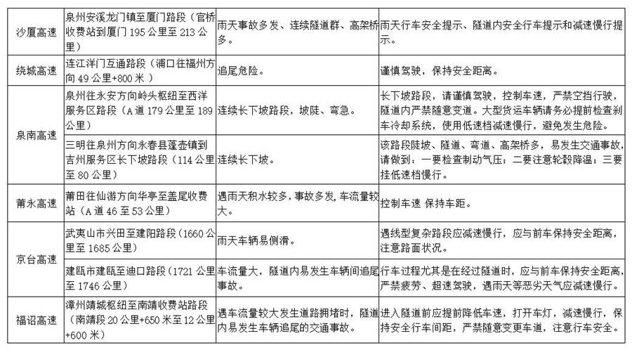 端午節(jié)假期福建各地高速公路危險和事故多發(fā)點段18個、易擁堵路段13個,管制路段1個,如下——