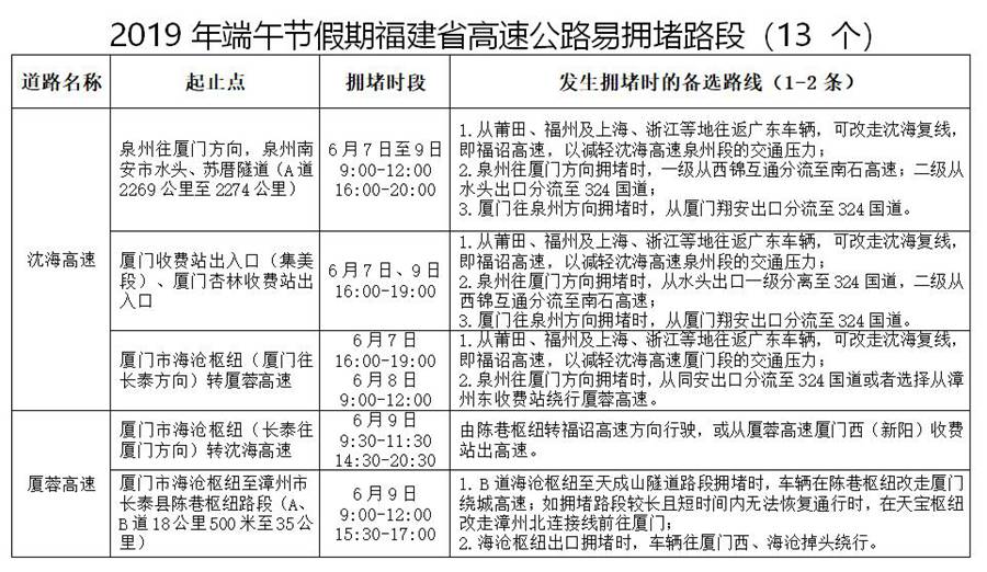 人民網(wǎng)福州6月5日電(余杉芳)來自福建省公安廳交警總隊的消息,2019年端午節(jié)假期為6月7日至9日,恰逢全國高考期間,相比清明、五一等節(jié)假日,高速公路網(wǎng)運行壓力較小,但車流量較平時會有明顯增加,部分路段車流量“潮汐”現(xiàn)象明顯。交警總隊發(fā)布了端午節(jié)假期福建各地高速行車安全提示,同時公布高速公路危險和事故多發(fā)點段有18個、易擁堵路段有13個,管制路段有1個。