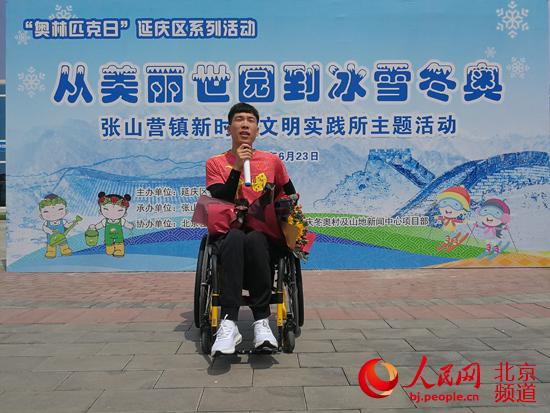 平昌冬殘奧會(huì)冠軍、土生土長(zhǎng)的延慶本地人陳建新與大家分享了他的冬奧會(huì)追夢(mèng)歷程。人民網(wǎng)尹星云 攝