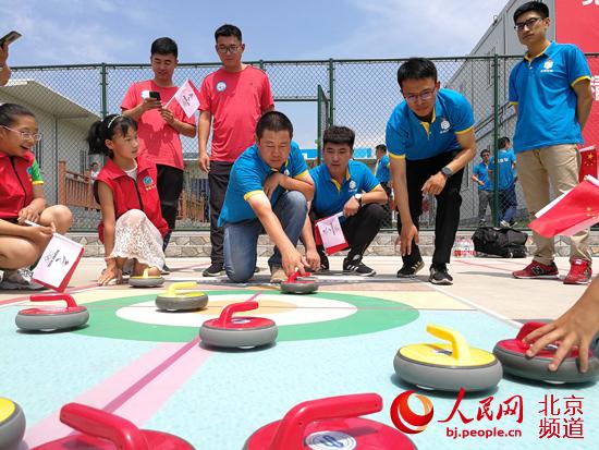 “海坨之星”地壺球隊(duì)的小隊(duì)員們,和冬奧工程一線建設(shè)者們一起打了一場(chǎng)充滿歡聲笑語(yǔ)的友誼地壺球賽。人民網(wǎng)尹星云 攝