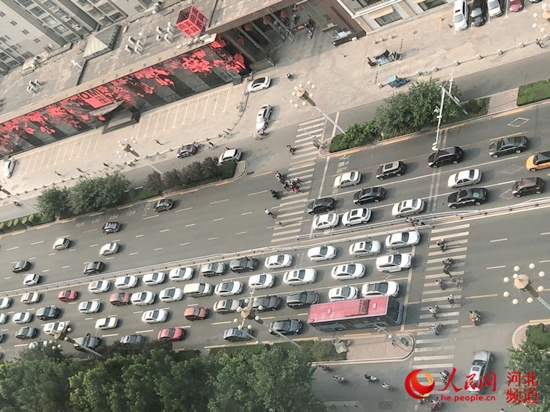 6月12日上午8時許,正值上班高峰期,石家莊市區(qū)主干道裕華路上,人多車多。裕華路與體育大街交口往東,北側(cè)是劍橋春雨小區(qū),南側(cè)是方北小區(qū),兩個小區(qū)門口正對裕華路的半幅機動車道上分別畫著斑馬線。因為附近有學(xué)校,南北兩側(cè)陸陸續(xù)續(xù)有送孩子的家長或騎車人從斑馬線通過裕華路。每當(dāng)有人通過斑馬線時,裕華路上的汽車都會停下來等候。由于行人三五成群,不斷通過,路上的汽車不得不繼續(xù)等候,以至于排起了長龍。