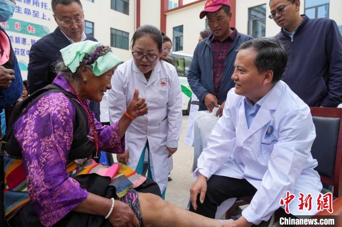 圖為青島醫(yī)療專家團(tuán)隊(duì)在日喀則為62歲的倉木拉老人進(jìn)行診斷,倉木拉對(duì)援藏醫(yī)療專家豎起大拇指。王建亮 攝