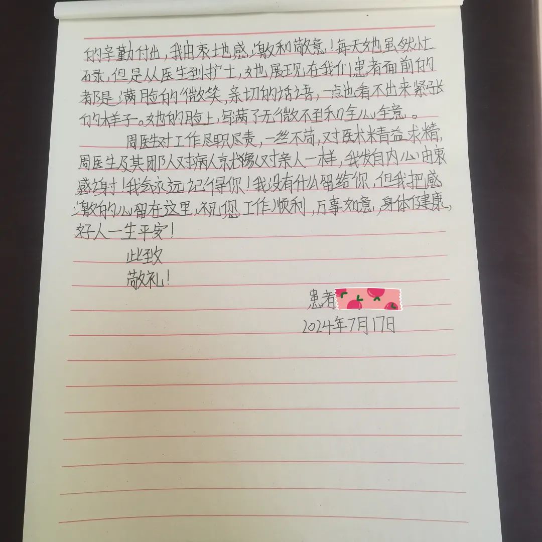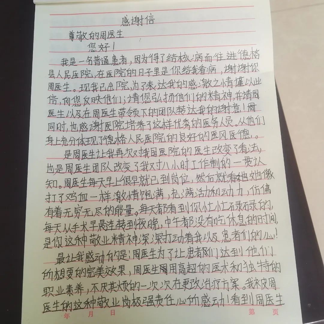 7月1日,一名在德格縣人民醫(yī)院就診的結(jié)核患者向成都市公共衛(wèi)生臨床醫(yī)療中心援藏醫(yī)師周瑜送來了一封感謝信,在信中,患者對周瑜醫(yī)生及其團隊在住院期間給予她的積極診治和熱情關懷表示感謝,并對科室團隊的診療技術和治療的預后效果都作出了非常高的評價。