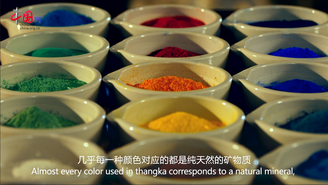 唐卡的色彩為什么璀璨奪目?關鍵就在這些顏料上,幾乎每一種顏色對應的都是純天然的礦物質,諸如金、珍珠、綠松石等,精心研磨而成,經(jīng)久而不衰。