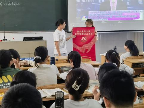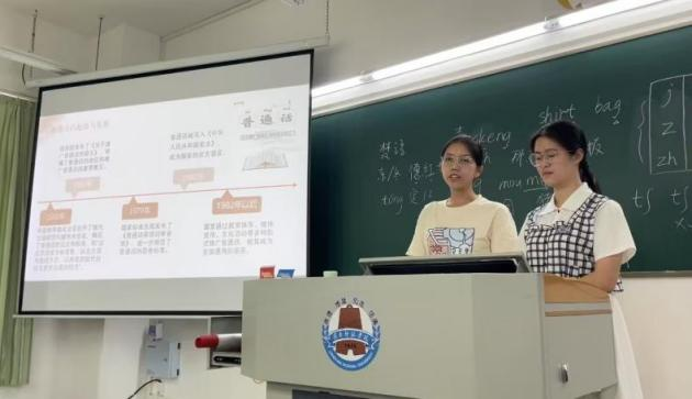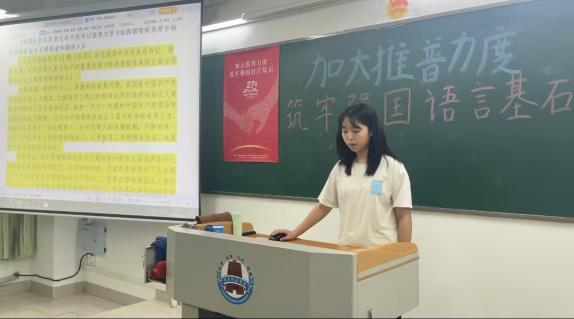 新學(xué)期伊始,《教師語言》課程教學(xué)團隊將推普宣傳與課程的“音韻筑基”內(nèi)容相結(jié)合,理論層面講解我國通用語言文字的相關(guān)法律政策和普通話聲、韻、調(diào)等基礎(chǔ)知識;實踐層面指導(dǎo)學(xué)生利用中國語言文字?jǐn)?shù)字博物館、師圈小程序等課程資源進行學(xué)習(xí),邀請學(xué)生介紹普通話的發(fā)展歷程和我國第27屆推普宣傳主題中所滲透的“強國必須強語,強語助力強國”價值內(nèi)涵。