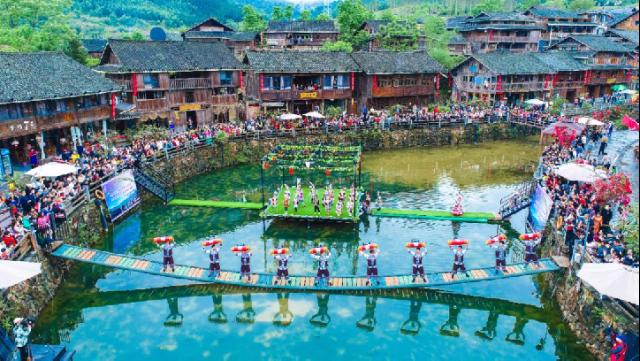 廣西投入中央財(cái)政少數(shù)民族發(fā)展資金1.6億元,打造民族村寨與鄉(xiāng)村旅游融合發(fā)展試點(diǎn)39個(gè)。圖為2024年4月廣西傳統(tǒng)民族節(jié)日“三月三”期間,來自全國(guó)的游客與夢(mèng)嗚苗寨村民一起慶祝節(jié)日。廣西壯族自治區(qū)柳州市民宗委供圖