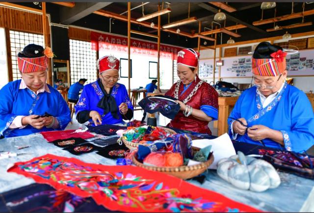 貴州省級(jí)非遺苗繡代表性傳承人龍祿穎創(chuàng)辦了非遺文化企業(yè),帶領(lǐng)各族群眾就業(yè)增收。圖為龍祿穎(右二)和公司員工們?cè)谑止ご汤C車間刺繡。新華社記者 楊文斌 攝