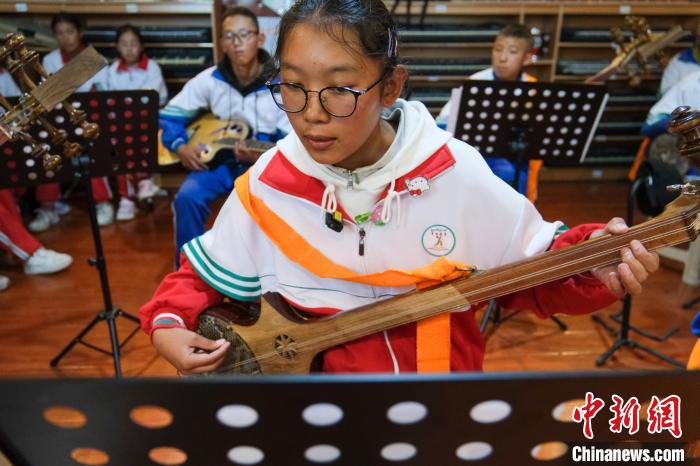 2024年9月9日,西藏山南浪卡子縣中學(xué)初二年級學(xué)生白瑪卓嘎學(xué)習(xí)彈六弦琴?!≈行律缬浾?江飛波 攝