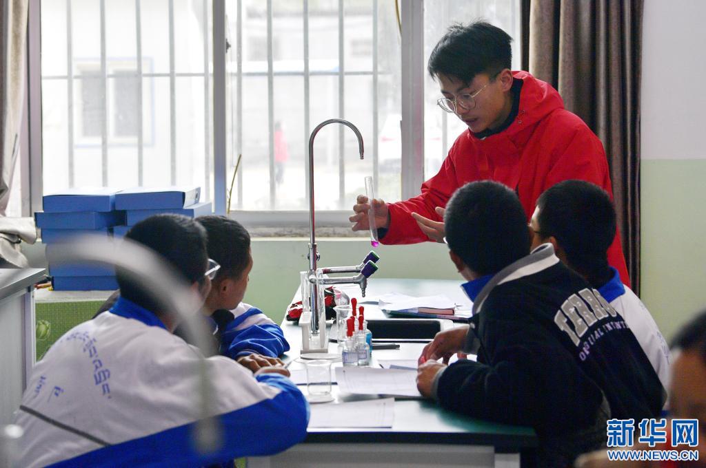 在山南市東輝中學(xué)實驗室,來自湖北大學(xué)化學(xué)化工學(xué)院的碩士研究生劉思江指導(dǎo)學(xué)生做化學(xué)實驗(3月29日攝)。新華社記者 張汝鋒 攝