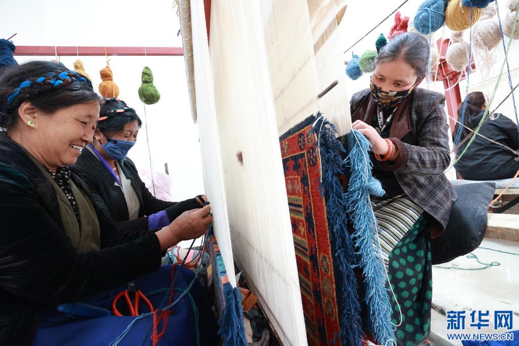 山南市瓊結縣農牧民在襄陽援藏工作隊引進的西藏薩喜欽布公司編織藏毯(2021年6月18日攝)。(受訪者供圖)
