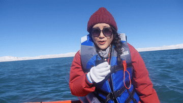 第一天早上,一路顛簸了近4個小時,我們一行抵達雀莫錯。雀莫錯是位于長江源頭區(qū)域的一個較大的湖泊。當(dāng)天,中科院青藏所的專家們需要在湖中心取水樣。站在湖邊,風(fēng)特別大,陽光刺到睜不開眼。通過反復(fù)溝通,我們爭取到了和專家一起上船采樣的機會。為什么要上湖?在湖邊出個鏡不香嗎?因為我始終相信,要拍到生動的一手資料,那就得離得足夠近。