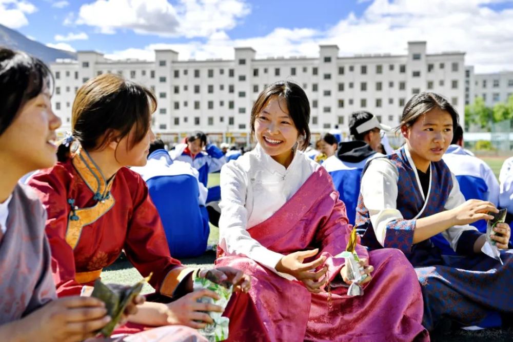 西藏山南市第二高級中學(xué)的學(xué)生品嘗安徽省援藏干部和企業(yè)家代表贈送的粽子(2022年6月3日攝) 張汝鋒 攝