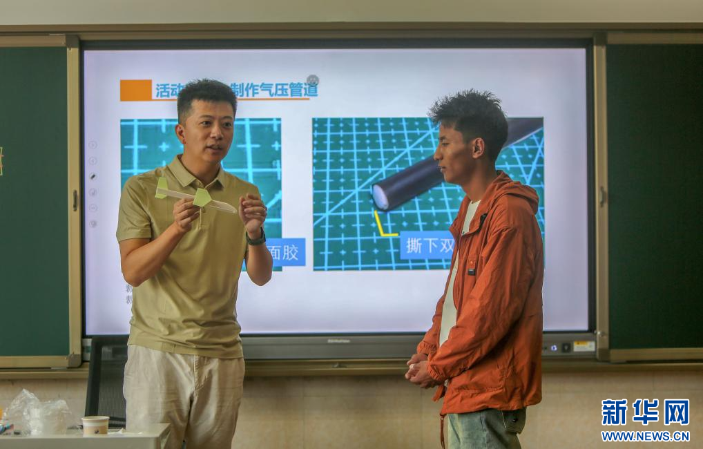 在《航空模型制作》課上,北京市少年宮科技教學(xué)部教師張文龍(左)正在與拉薩本地教師進(jìn)行互動(dòng)(8月23日攝)。新華社記者 邵澤東 攝