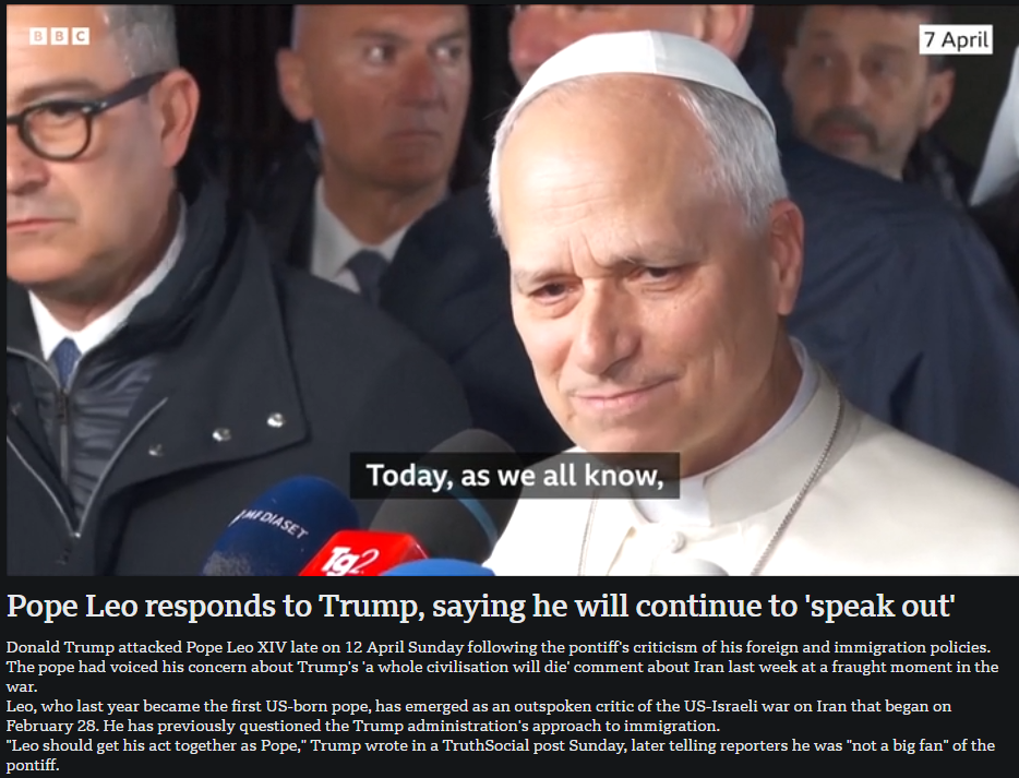 4月13日,羅馬教皇利奧十四世回應(yīng)特朗普批評(píng)表示將繼續(xù)“發(fā)聲”。來(lái)源:英國(guó)廣播公司